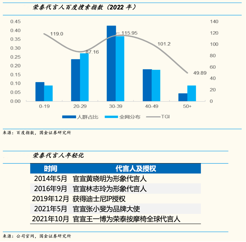 經(jīng)典案例:根據(jù)百度指數(shù)、公司官網(wǎng)、國(guó)金證券研究所等綜合資訊表明,家電龍頭企業(yè)自 2021 年以來(lái)紛紛官宣當(dāng)紅年輕流量明星為代言人,張小斐因在2021年初主演《你好,李煥英》迅速走紅,榮泰健康公司2021年先啟用張小斐為代言人,快速跟上熱點(diǎn),并于10 月官宣流量更高的王一博。從 2014 年邀請(qǐng)黃曉明代言到2021 年,公司傳播主攻人群轉(zhuǎn)年輕消費(fèi)者群體。