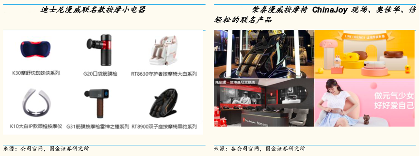 經(jīng)典案例:根據(jù)公司官網(wǎng)、國(guó)金證券研究所等綜合資訊表明,榮泰健康公司借鑒對(duì)標(biāo)BODYFRIEND,BODYFRIEND 曾與迪士尼米老鼠、漫威系列聯(lián)名推出按摩器具。公司 2019 年 底與迪士尼合作,與其旗下知名IP 超能陸戰(zhàn)隊(duì)、漫威系列聯(lián)名推出按摩椅 (RT8630 大白系列、RT8900 黑豹系列等)、按摩小電器如筋膜槍、頸部按摩儀系列。