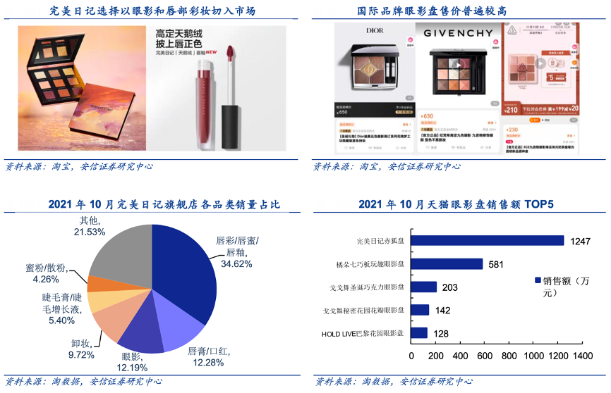 經(jīng)典案例:根據(jù)淘寶、淘數(shù)據(jù)、安信證券研究中心等綜合資訊表明,完美日記以 120 元左右的多色眼影盤和 70 元左右的唇釉進(jìn)入市場,同時(shí)保持高出新速度,根據(jù)招股書披露,截至 2020Q3 完美日記共有 SKU1363 個(gè),其新產(chǎn)品從概念到正式上線僅需不到 6 個(gè)月,遠(yuǎn)低于國際品牌 7-18 個(gè)月的出新時(shí)間。在選品上結(jié)合技術(shù)打造爆款,例如在唇部彩妝選品時(shí),提取了天貓 40000 個(gè)唇妝 SKU 的 RGB 數(shù)值,匯總出最熱門的顏色排序并應(yīng)用于產(chǎn)品優(yōu)化中。