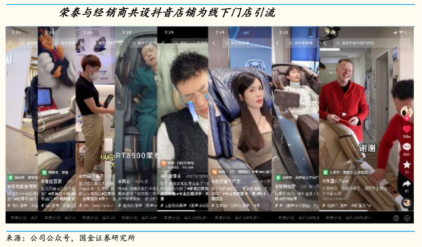 經(jīng)典案例:根據(jù)公司公眾號、國金證券研究所等綜合資訊表明,榮泰健康公司利用線上營銷的優(yōu)勢,線上進(jìn)一步為線下引流。其于2021年嘗試與經(jīng)銷商共設(shè)抖音店鋪,為線下門店引流;并通過抖音、視頻號等平臺的重點(diǎn)運(yùn)營,為線下完成視頻拍攝制作超 400 條,支撐門店、商場、展會等渠道的傳播。