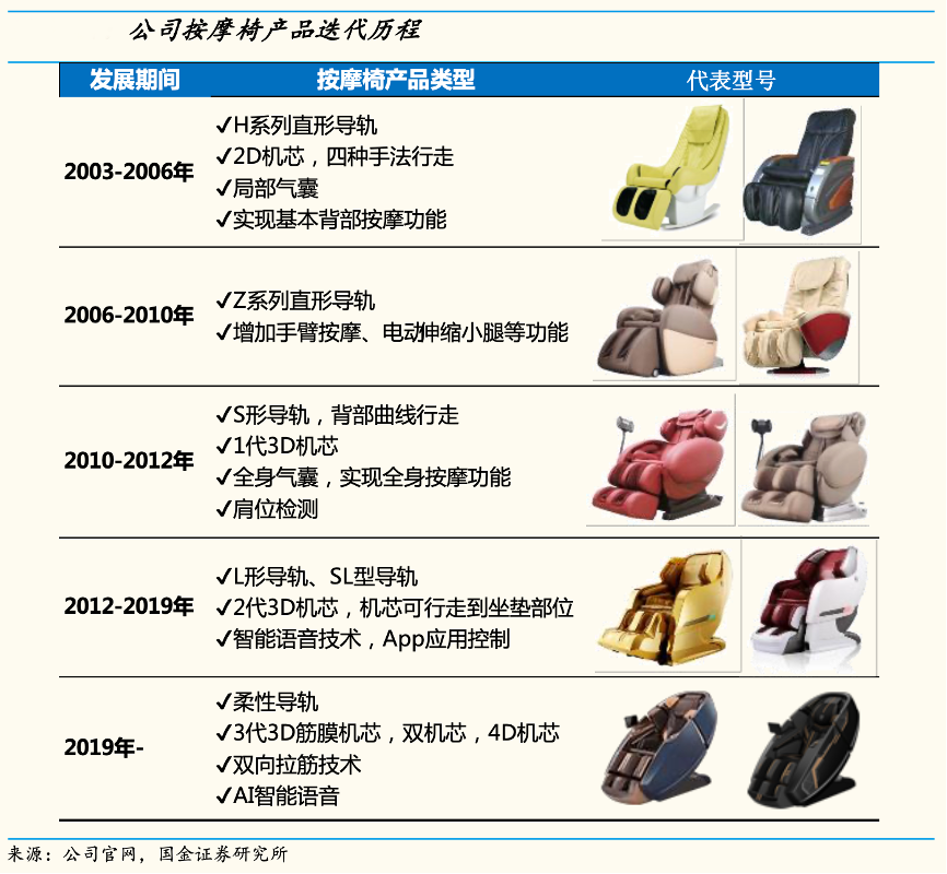 經(jīng)典案例:根據(jù)公司官網(wǎng)、國金證券研究所等綜合資訊表明,榮泰健康按摩椅產(chǎn)品迭代快速,經(jīng)歷從 2D 機(jī)芯到3 代 3D 機(jī)芯,從單機(jī)芯到雙機(jī)芯配置的演進(jìn),2019年公司進(jìn)一步推出 4D 機(jī)芯,通過上下按摩球雙向運(yùn)動,使按摩力度滲透至肌肉深層筋膜。