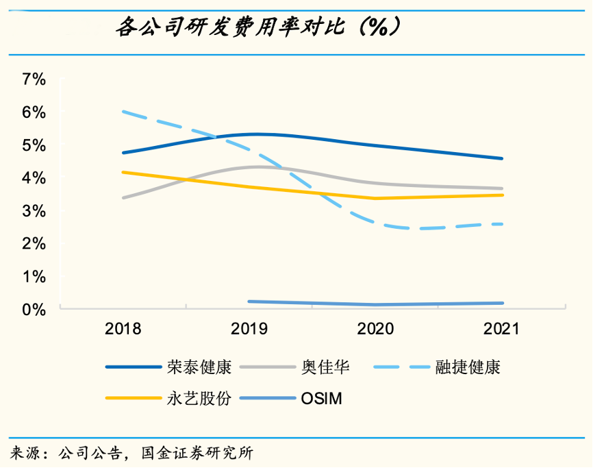 經(jīng)典案例:根據(jù)公司公告、國(guó)金證券研究所等綜合資訊表明,榮泰健康研發(fā)保持高投入,2021年公司研發(fā)投入為1.2 億元,占營(yíng)收比重為 4.6%,在行業(yè)可比公司中最高,奧佳華、融捷健康、永藝股份,分別為 3.7%、2.6%、3.4%,外資龍頭 OSIM 研發(fā)費(fèi)用率僅為 0.18%,研發(fā)費(fèi)用率和絕對(duì)研發(fā)投入都與內(nèi)資品牌形成較大差距。
