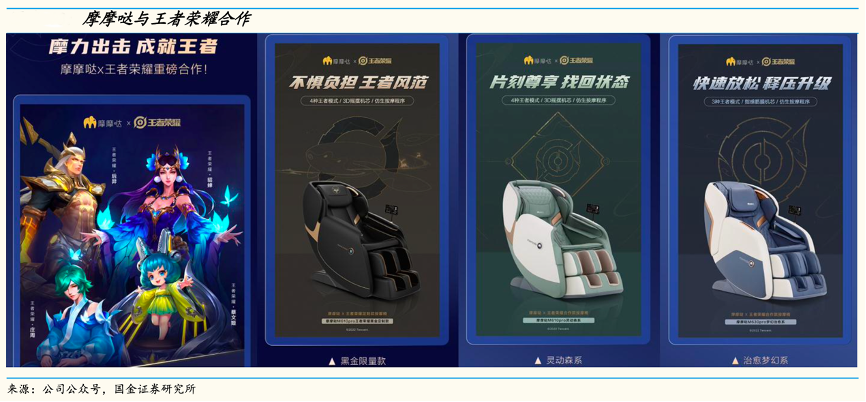 2022年5月,摩摩噠和王者榮耀合作發(fā)布英雄系列按摩椅,推出黑金限量款、靈動(dòng)森系、治愈夢(mèng)幻系三款產(chǎn)品,成為舒適破圈的一次成功嘗試。
