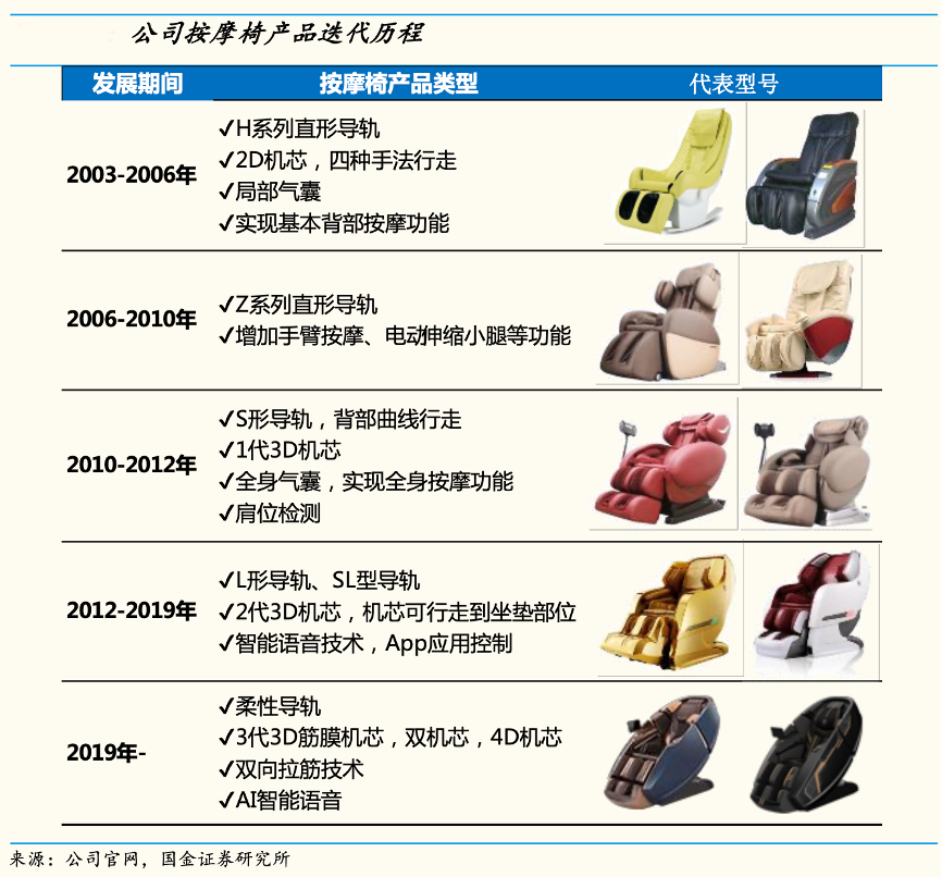 經(jīng)典案例:根據(jù)公司官網(wǎng)、國金證券研究所等綜合資訊表明,榮泰健康公司產(chǎn)品經(jīng)歷5次迭代,領先行業(yè)1-2 代。尤其是在機芯方面,其經(jīng)歷從 2D 機芯到 3 代 3D 機芯,從單機芯到雙機芯配置的演進,2019年進一步推出4D 機芯,通過上下按摩球雙向運動,使按摩力度滲透至肌肉深層筋膜。