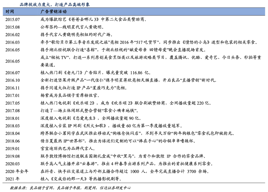 經(jīng)典案例:根據(jù)良品鋪?zhàn)庸倬W(wǎng)、良品鋪?zhàn)幽陥?bào)、荊楚網(wǎng)、信達(dá)證券研發(fā)中心等綜合資訊表明,良品鋪?zhàn)庸就ㄟ^(guò)影視作品植入、電視節(jié)目冠名等營(yíng)造產(chǎn)品高端形象,終端通過(guò)店員培訓(xùn)、門店高端形象展示打造高端體驗(yàn)。其通過(guò) “產(chǎn)品、傳播、體驗(yàn)”三位一體全面做實(shí)高端,賦予高品質(zhì)、高顏值、高體驗(yàn)的產(chǎn)品內(nèi)涵,高端零食形象有望率先搶占消費(fèi)者心智。