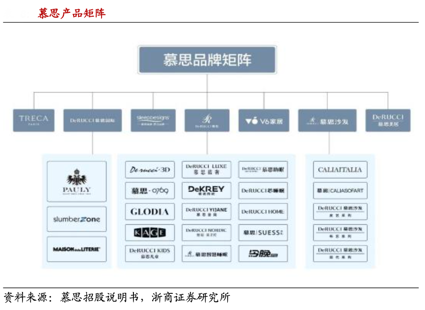 經(jīng)典案例:根據(jù)慕思招股說明書、浙商證券研究所等綜合資訊表明,慕思構(gòu)建全覆蓋的產(chǎn)品矩陣,可滿足不同用戶定制化的睡眠需求。目前已形成 7 大 主力品牌,包括“慕思”、“V6 家居”、“崔佧(TRECA)”、“慕思國際”、“思麗德賽(Sleep Designs)”、“慕思沙發(fā)”和“慕思美居”,構(gòu)建了完整的中高端及年輕時(shí)尚品牌矩陣,可滿足消費(fèi)者定制化的健康睡眠需求。