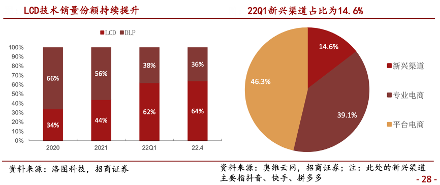 經(jīng)典案例:根據(jù)洛圖科技、奧維云網(wǎng)、招商證券等綜合資訊表明,智能投影主要通過線上銷售,線上銷量占比達80%以上(洛圖科技),一般通過京東、天貓等傳統(tǒng)電商平臺購買;直播帶貨的發(fā)展,拉動抖音、快手等短視頻電商平臺交易額快速增長,而隨著2021年下半年拼多多加大短視頻業(yè)務的布局,智能投影品類也從中受益,根據(jù)奧維云網(wǎng)數(shù)據(jù),22Q1智能投影品類在抖音、快手、拼多多等社交電商平臺市場份額合計已達14.6%,4月進一步提升至21%。