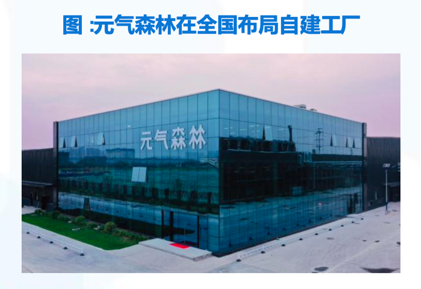 經(jīng)典案例:根據(jù)公司網(wǎng)站、國(guó)泰君安證券研究等綜合資訊表明,元?dú)馍种饕a(chǎn)品包括無(wú)糖氣泡水(元?dú)馍?/無(wú)糖奶茶(乳茶),其他產(chǎn)品覆蓋茶飲料、功能性飲料、果汁飲料、電解質(zhì)飲料等多個(gè)品類。自2019年開始,元?dú)馍珠_始在全國(guó)布局自建工廠,先后在安徽滁州、廣東肇慶、天津西青、湖北咸寧、 四川都江堰等地籌建工廠并陸續(xù)投產(chǎn)。5大工廠總投資55億元,分別對(duì)應(yīng)華東、華南、華北、華中、西南地區(qū)5大城市集群。