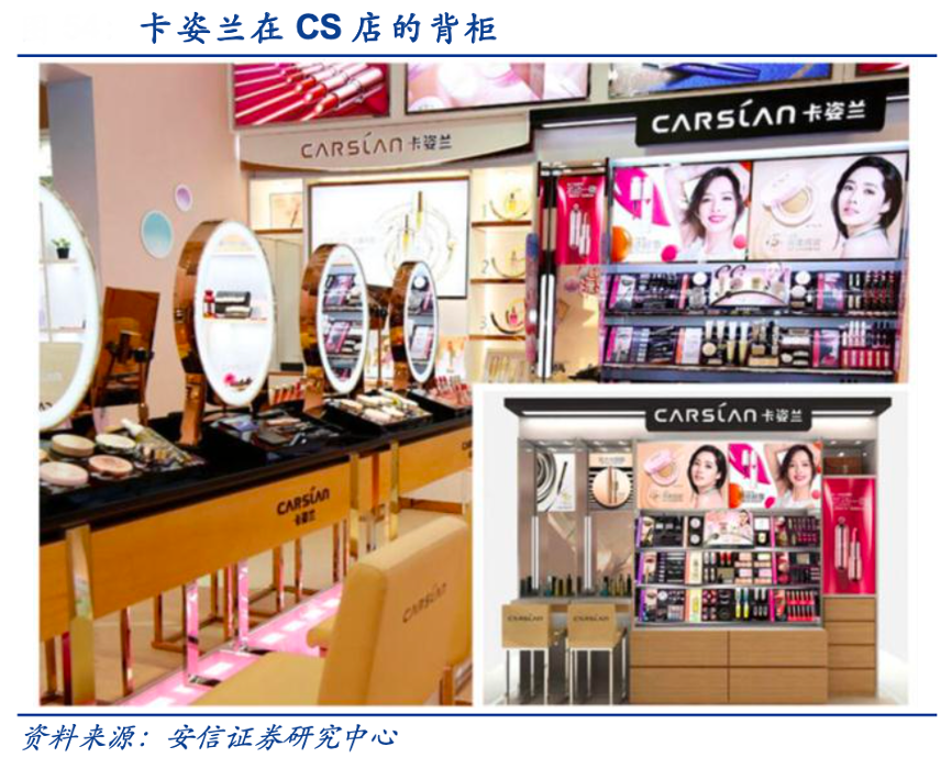 經(jīng)典案例:根據(jù)安信證券研究中心等綜合資訊表明,以卡姿蘭為例,卡姿蘭誕生于 2001 年,其選擇以 CS 店突圍,在加大廣告 宣傳的同時,進行專業(yè)培訓(xùn)幫助門店銷售,扭轉(zhuǎn)了當時國內(nèi)彩妝無形象柜、無化妝師的印象,為其后來走進商超和百貨、進入中國彩妝市場 TOP10 打下了基礎(chǔ)。根據(jù)品觀APP,2018年卡姿蘭仍占據(jù)國內(nèi)眾多 CS 店彩妝銷售50%的份額。