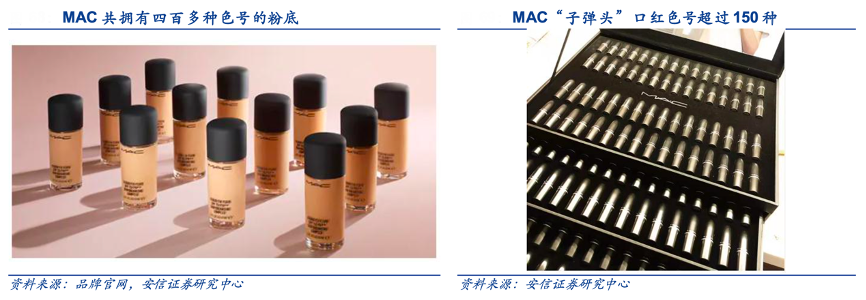 經(jīng)典案例:根據(jù)品牌官網(wǎng)、安信證券研究中心等綜合資訊表明,MAC為滿足拉美消費(fèi)者睫毛朝下的特定訴求,開(kāi)發(fā)“Up For Everything”睫毛膏,該產(chǎn)品最終在墨西哥和智利銷量排名第一;擁有四百多種色號(hào)的粉底,以滿足全球消費(fèi)者不同的膚質(zhì)和膚色。