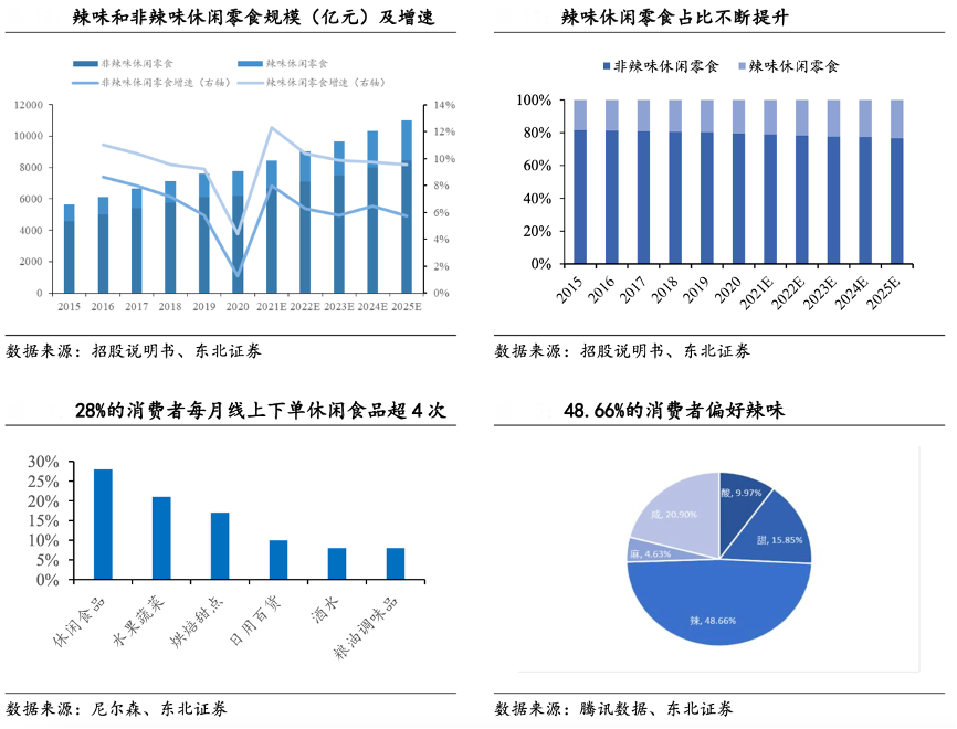 經(jīng)典案例:根據(jù)招股說(shuō)明書(shū)、尼爾森、騰訊數(shù)據(jù)、東北證券等綜合資訊表明,休閑零食高頻消費(fèi)特征明顯,弗若斯特沙利文隨機(jī)抽取 2200 名消費(fèi)者調(diào)研的結(jié)果顯示,81.9%的受訪者每 周至少消費(fèi) 1 次休閑零食,34.6%的受訪者每周至少消費(fèi) 2-3 次休閑零食,尼爾森研 究結(jié)果顯示,28%的消費(fèi)者平均每月線上下單休閑食品 4 次以上。辣味成癮性帶動(dòng)消費(fèi)需求進(jìn)一步上升。
