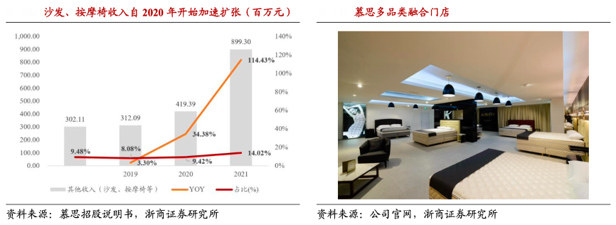 經(jīng)典案例:根據(jù)慕斯招股說明書、公司官網(wǎng)、浙商證券研究所等綜合資訊表明,2017年慕思開始研發(fā)、生產(chǎn)、銷售 沙發(fā),最初品牌名為愛慕,同時也引進(jìn)了意大利品牌卡利亞。2019-2021 年公司其他收入(主要為沙發(fā)、按摩椅)從 3.12 億增長至 8.99 億,其中 2021 年增速為 114%、迅速發(fā)力,收入占比提升至 14.02%。