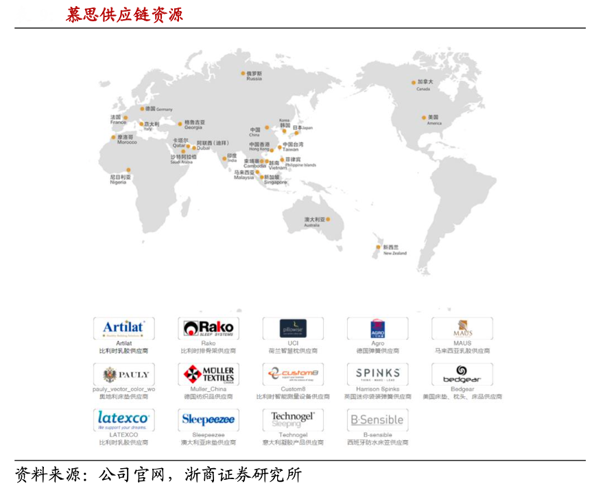 經(jīng)典案例:根據(jù)公司官網(wǎng)、浙商證券研究所等綜合資訊表明,慕思與德國 Agro 彈簧供應(yīng)商、美國 Bedgear 床墊、枕頭、床品供應(yīng) 商、意大利 Technogel 凝膠供應(yīng)商建立穩(wěn)定的長期合作協(xié)議,采購優(yōu)質(zhì)原材料,引進(jìn)世界先進(jìn)的寢具制造材料和技術(shù),實(shí)現(xiàn)產(chǎn)品質(zhì)量的有力的保障、產(chǎn)品技術(shù)的不斷革新與迭代。