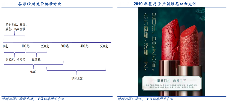 經(jīng)典案例:根據(jù)魔鏡電商、淘寶、安信證券研究中心等綜合資訊表明,在定價上,國際大牌散粉價格大都在 300 元以上,國產(chǎn)品牌在百元以下,花西子卡位市場空白,定價 150 元左右,競品少、精準吸引目標客群,蜜粉也成為花西子第一款爆款產(chǎn)品。