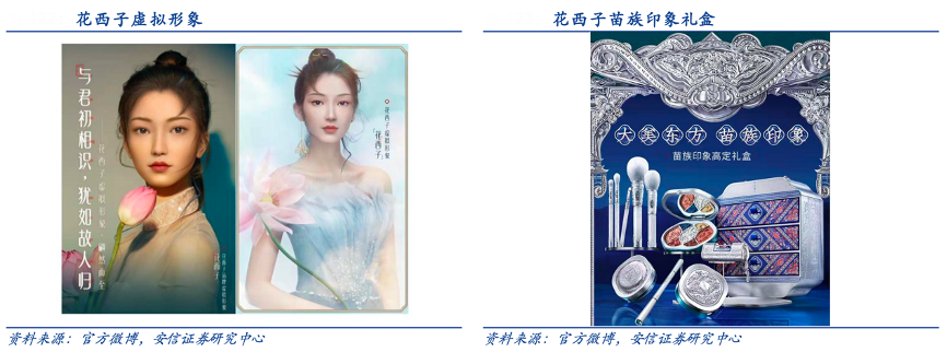 經(jīng)典案例:根據(jù)官方微博、安信證券研究中心等綜合資訊表明,花西子2021年6月其虛擬 IP 形象誕生,其面相符合東方傳統(tǒng)審美,擁有眉間美人痣,頭發(fā)挑染品牌色黛色,以蓮葉作為耳飾并手持“并蒂蓮”,絕世獨立,是品牌人格化的集中展現(xiàn)。
