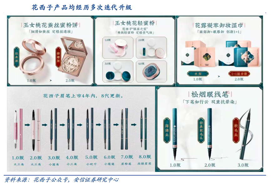 經(jīng)典案例:根據(jù)花西子公眾號、安信證券研究中心等綜合資訊表明,花西子通過實時跟進用戶反饋進行產(chǎn)品升級,四年里歷經(jīng)了眉筆 8 次迭代、蜜粉 4 次更新、眼 線筆 3 次升級,切實滿足消費者需要。