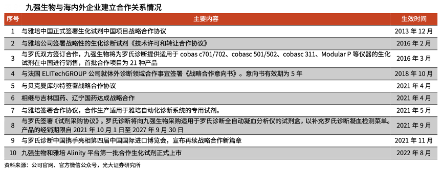 經(jīng)典案例:根據(jù)公司官網(wǎng)、官方微信公眾號、光大證券研究所等綜合資訊表明,自2013年起,九強生物公司與雅培、羅氏、日立、邁瑞、威高等國內(nèi)外知名企業(yè)陸續(xù)建立起生化戰(zhàn)略合作關系。公司與雅培簽署的《技術(shù)許可和轉(zhuǎn)讓合作協(xié)議》,更是開創(chuàng)了中國 IVD 企業(yè)技術(shù)輸出的先河。公司與國內(nèi)外企業(yè)的合作內(nèi)容主要包括與邁瑞醫(yī)療就全自動生化分析儀 BS-2000M 開展合作、為雅培及羅氏提供 OEM 代工服務等。其中,公司與雅培的合作區(qū)域在國內(nèi)市場,與羅氏的合作區(qū)域在國內(nèi)和亞太地區(qū),公司通過“借船出海”,深化了海外市場發(fā)展戰(zhàn)略。