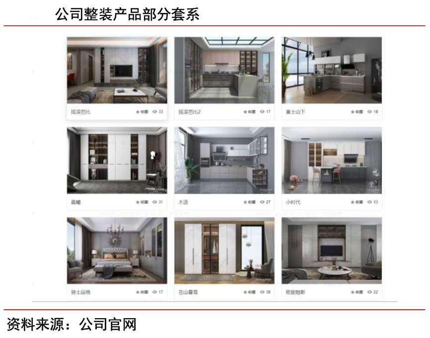 經(jīng)典案例:根據(jù)公司官網(wǎng)、中信證券研究部等綜合資訊表明,以志邦品牌拓展整裝模式,并通過(guò)產(chǎn)品體系重構(gòu),將原 IK 品牌產(chǎn)品融入整裝渠道,并針對(duì)性開發(fā)符合裝企風(fēng)格的套系化產(chǎn)品,官網(wǎng)顯示已有輕奢、 簡(jiǎn)中風(fēng)格、簡(jiǎn)美風(fēng)格、簡(jiǎn)約風(fēng)格 4 個(gè)類型共 17 套產(chǎn)品。