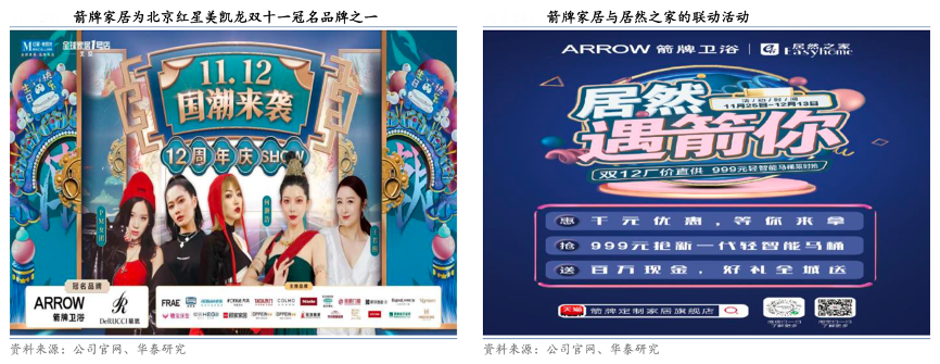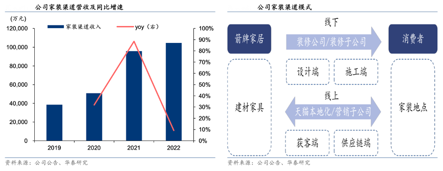 經(jīng)典案例:根據(jù)公司公告、華泰研究等綜合資訊表明,箭牌家居公司積極拓展家裝渠道,與全國性頭部家裝公司達成戰(zhàn)略合作并由各地經(jīng)銷商落地實施,同時,公司各區(qū)域服務人員協(xié)同經(jīng)銷商開展“家裝城市合伙人”等活動以開拓當?shù)刂行∥⒓已b企業(yè),并提供專項產(chǎn)品方案。2022年,公司家裝渠道實現(xiàn)營收 10.5 億元,同比+9.2%;占總收入13.9%,同比+2.5pct。
