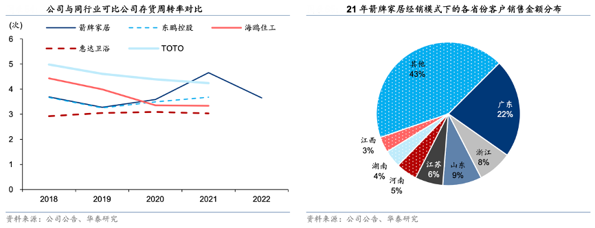 經(jīng)典案例:根據(jù)公司公告、華泰研究等綜合資訊表明,從區(qū)域來看,箭牌家居公司經(jīng)銷收入主要集中在華南廣東省,華東江浙兩省、山東省,以及華中河南省,2019-2021年間,上述五省經(jīng)銷收入分別占總經(jīng)銷收入46.37%、50.46%和 49.79%。 這五省的經(jīng)銷商數(shù)量也最多,主要原因是這五省經(jīng)濟較好,2021 年,上述五省也是國內省份GDP 產值最高的 TOP5。