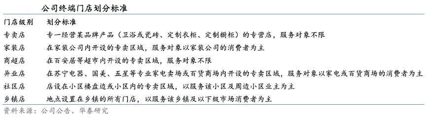 經(jīng)典案例:根據(jù)公司公告、華泰研究等綜合資訊表明,箭牌家居公司的門店主要分為專賣店、家裝店、商超店、異業(yè)店、社區(qū)店、鄉(xiāng)鎮(zhèn)店 6 種,分別針對(duì)不同的產(chǎn)品以及終端消費(fèi)者。公司對(duì)門店的管理主要通過(guò)對(duì)經(jīng)銷商的管理而實(shí)現(xiàn),主要體現(xiàn)在門店裝修補(bǔ)貼上,公司按照門店不同規(guī)格,統(tǒng)一制定了規(guī)范裝修樣板,經(jīng)銷商/分銷商的門店均需要按照上述標(biāo)準(zhǔn)統(tǒng)一裝修,維護(hù)統(tǒng)一的標(biāo)識(shí)和對(duì)外形象。