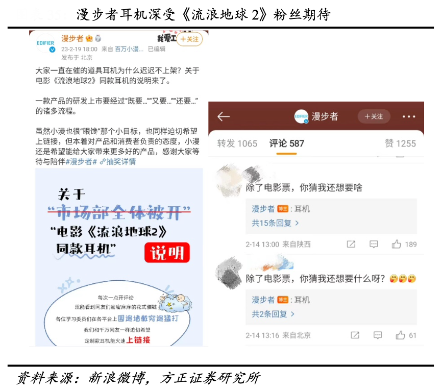 經(jīng)典案例:根據(jù)新浪微博、方正證券研究所等綜合資訊表明,漫步者公司作為 2023 年初熱映電影《流浪地球2》的獨家耳機合作品牌,根據(jù)電影設(shè) 定和導(dǎo)演要求量身定制了四款未來概念耳機;本次影視植入不僅通過將公司與《流浪地球 2》IP 綁定助力品牌知名度提升,還在一定程度上實現(xiàn)了精準營銷,抓住電影影迷大多關(guān)注和熱愛科技的特性,有針對性的激發(fā)特定客群的消費欲望。