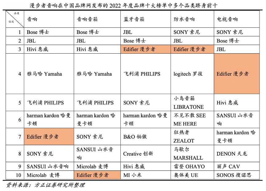 經(jīng)典案例:根據(jù)中國品牌網(wǎng)、方正證券研究所等綜合資訊表明,漫步者在中國品牌網(wǎng)發(fā)布的 2022 年度品牌十大榜單中,漫步者耳機和音響大類及其多個細分品類躋身前十,藍牙音箱、防水音響躋身前三,游戲耳機排名第一。