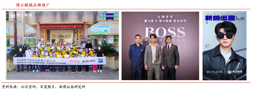 經(jīng)典案例:根據(jù)公司官網(wǎng)、百度圖片、浙商證券研究等綜合資訊表明,針對專業(yè)視光定位的博士眼鏡品牌,其公司與眼科醫(yī)院合作成立視光中心為青少年提供專業(yè)配鏡服務(wù),同時攜手蔡司舉辦公益助童活動,為偏遠鄉(xiāng)村孩童提供免費驗光服務(wù)和眼鏡產(chǎn)品,提升品牌專業(yè)形象;同時其公司積極與 HUGO BOSS、BOLON 等國際高奢時尚品牌合作,通過推出聯(lián)名產(chǎn)品、開設(shè)聯(lián)合快閃店、開展明星活動等進行品牌營銷推廣。