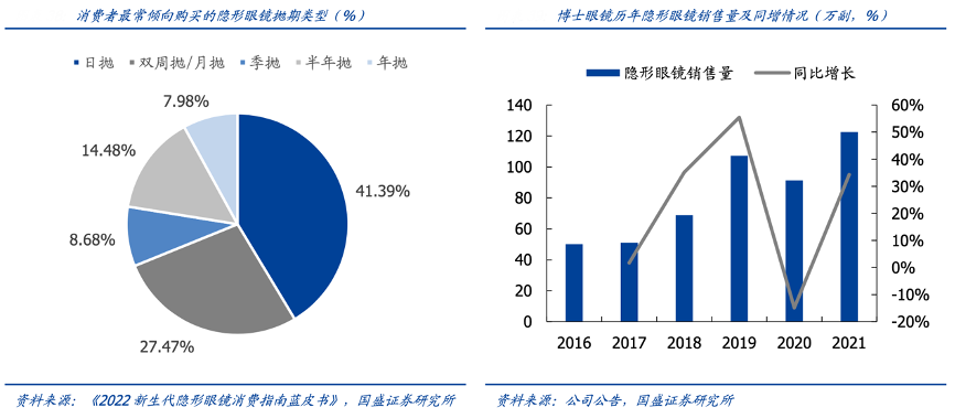 經(jīng)典案例:根據(jù)公司公告、《2022新生代隱形眼鏡消費指南藍皮書》、國盛證券研究所等綜合資訊表明,隱形眼鏡具備美觀和易佩戴的特性,且“越短越健康”等理念深入人心,博士眼鏡公司短周期隱形眼鏡受到消費者青睞,促進隱形眼鏡系列產品銷量高增,2016-2021公司隱形眼鏡銷售量從 50.1 萬副增長至 122.6 萬副,營收從 7788 萬增長至 1.42 億元。