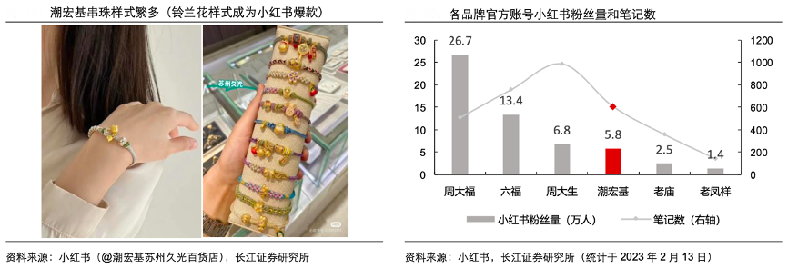 經(jīng)典案例:根據(jù)小紅書、小紅書(@潮宏基蘇州久光百貨店)、長(zhǎng)江證券研究所等綜合資訊表明,潮宏基從年輕時(shí)尚的差異化品牌定位和設(shè)計(jì)精湛、推新速度快的優(yōu)勢(shì)能力出發(fā),推出樣式繁多的輕巧串珠,相較于其他品牌多數(shù)產(chǎn)品在設(shè)計(jì)風(fēng)格和克重上偏厚重的款式,更容易贏得年輕消費(fèi)者的青睞,通過(guò)小紅書等 社交平臺(tái)上的種草傳播,串珠系列迅速成為網(wǎng)紅產(chǎn)品,形成了初具規(guī)模的粉絲基礎(chǔ)。