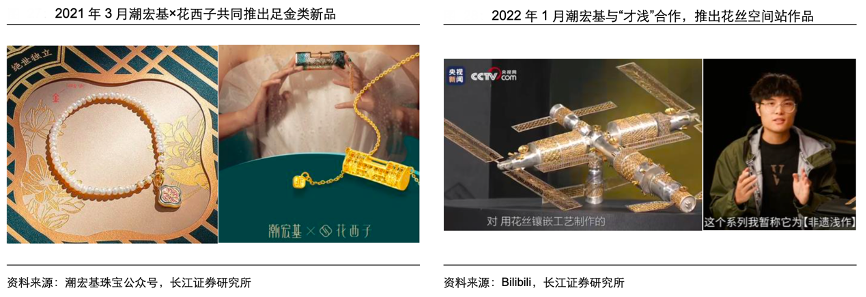 經(jīng)典案例:根據(jù)潮宏基珠寶公眾號、Bilibili、長江證券研究所等綜合資訊表明,潮宏基2021 年 3 月,潮宏基聯(lián)合以中國傳統(tǒng)美學元素為核心的國貨美妝品牌花西子,共同推出并蒂同心足金手鏈、心之鎖向足金墜鏈等新品;2022 年 1 月,潮宏基聯(lián)合 Bilibili 上 擁有 484 萬粉絲的手工界頂流 UP 主“才疏學淺的才淺”,利用花絲工藝打造了中國空間站模型,創(chuàng)作視頻播放量達到 504 萬,投幣量高達 110 萬,成為 B 站上少見的“幣比贊 多”的視頻作品(意味著觀眾看完視頻甚至產(chǎn)生了“付費”意愿,體現(xiàn)強烈的認可和贊賞)。