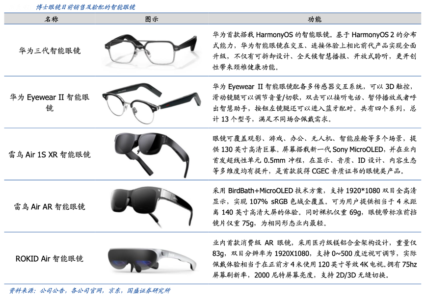 經(jīng)典案例:根據(jù)公司公告、各公司官網(wǎng)、京東、國盛證券研究所等綜合資訊表明,博士眼鏡公司積極利用數(shù)字化賦能眼鏡產(chǎn)品,將數(shù)字技術(shù)與眼鏡應(yīng)用場景疊加;2022年 5 月,公司與雷鳥創(chuàng)新達成戰(zhàn)略合作并成立聯(lián)合實驗室,圍繞人體佩戴工學(xué)、光波導(dǎo) AR 眼鏡的近視解決方案進行研發(fā)攻關(guān),探索近視鏡片與光波導(dǎo) AR 眼鏡的最佳融合方案。