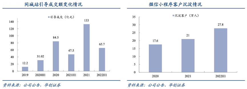 經(jīng)典案例:根據(jù)公司公告、華創(chuàng)證券等綜合資訊表明,2019-2021 年,居然之家同城站業(yè)務(wù) GMV 從 97.6 億元提升至 133 億元,GAGR達 16.74%。除天貓外,居然之家也布局微信小程序+企業(yè)微信,構(gòu)造私域流量池,通過線上多渠道流量建設(shè)將線上流量引導(dǎo)至線下賣場及商戶實現(xiàn)消費轉(zhuǎn)化,實現(xiàn)線上線下融合的消費閉環(huán)。2021年引導(dǎo)成交額達 133 億元;2022年上半年覆蓋門店 272 家,留資獲客 76.1 萬人,沉淀客戶 27.8 萬人,引導(dǎo)銷售 31.3 億元。