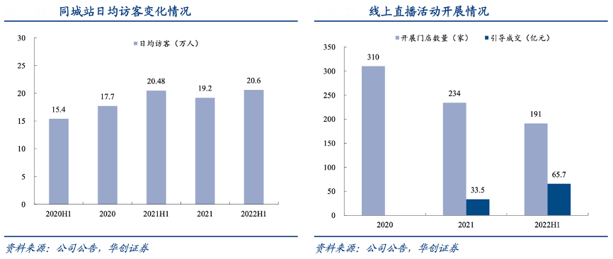 經(jīng)典案例:根據(jù)公司公告、華創(chuàng)證券等綜合資訊表明,依托由阿里賦能的線上平臺及線下門店數(shù)字化能力,居然之家可以利用淘寶直播平臺進行線上營銷,實現(xiàn)線下門店流量增長及引導(dǎo)成交。2019-2021 年,同城站引導(dǎo)成交額從 12.2 億元大幅提升至 133 億元。2022 年上半年,同城站業(yè)務(wù)覆蓋全國 130 個城市,日均訪客達 20.6 萬人次。上半年還開展多場線上營銷活動,其中 6.18 活動實現(xiàn)線上成交 17.8 億元,同比增長169%;“老汪來了”直播當(dāng)天店鋪 UV 突破 210 萬。