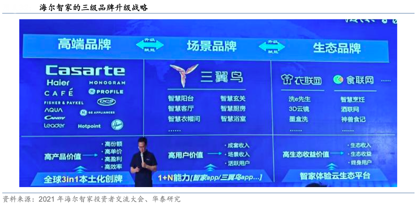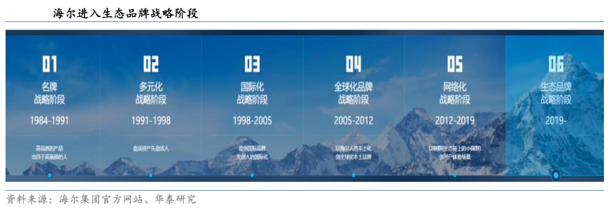 經(jīng)典案例:根據(jù)海爾集團官方網(wǎng)站、華泰研究等綜合資訊表明,1984 年成立以來,海爾集團從以冰箱為主的商業(yè)形態(tài)為起點,不斷橫向、縱向拓張,2019 年海爾提出生態(tài)品牌戰(zhàn) 略,繼續(xù)驅(qū)動企業(yè)商業(yè)模式發(fā)展變化。2020 年在海爾集團創(chuàng)業(yè) 35 周年大會上,張瑞敏主席提到“產(chǎn)品會被場景替代,行業(yè)將被生態(tài)覆蓋”,物聯(lián)網(wǎng)時代用戶不再需要一臺功能性的產(chǎn)品,而是需 要體驗迭代的解決方案。