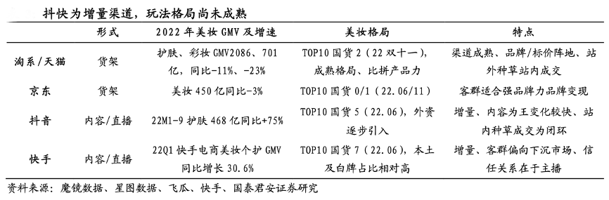 經(jīng)典案例:根據(jù)魔鏡數(shù)據(jù)、星圖數(shù)據(jù)、飛瓜、快手、國(guó)泰君安證券研究等綜合資訊表明,平臺(tái)方面,據(jù)星圖數(shù)據(jù),2022 雙十一綜合電商、直播電商 GMV 同比+3%、+146%,抖音、快手等直播電商通過(guò)內(nèi)容觸達(dá)-直播成交閉環(huán)優(yōu)化渠道效率迅速崛起表現(xiàn)顯著好于傳統(tǒng)貨架電商,但直播電商的內(nèi)容屬性也使得運(yùn)營(yíng)標(biāo)準(zhǔn)化天然較貨架電商低,各品牌盈利能力高度分化。