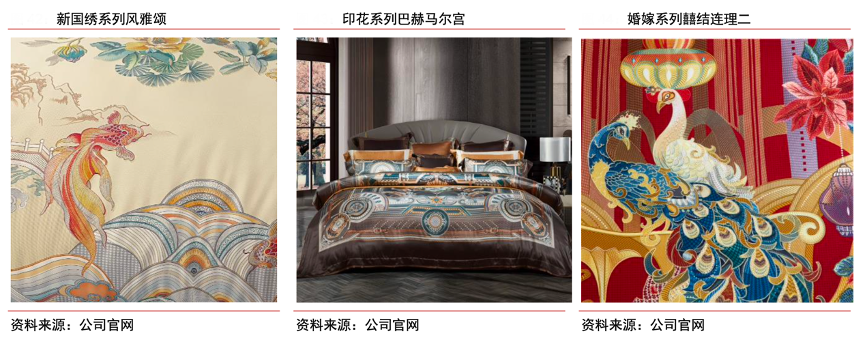 經典案例:根據(jù)公司官網(wǎng)、中信證券研究部等綜合資訊表明,富安娜將四大名繡(湘繡,蜀繡,潮繡,蘇繡) 與現(xiàn)代設計結合,打造新國繡系列新品,如風雅頌款以中式圖案為基本元素結合時下流行的煙灰色、水藍色、琉璃黃,打造沉穩(wěn)內斂的中式美學寢居。印花系列的巴赫馬爾宮采用真絲大提花設計,獨服平網(wǎng)印花,舒適親膚,畫面主題突出?;榧尴盗械膰纸Y連理以珠寶 孔雀為主要元素,周邊飾以歐式噴泉和并蒂鳶尾花,蘊含美好寓意,設計精美大氣。