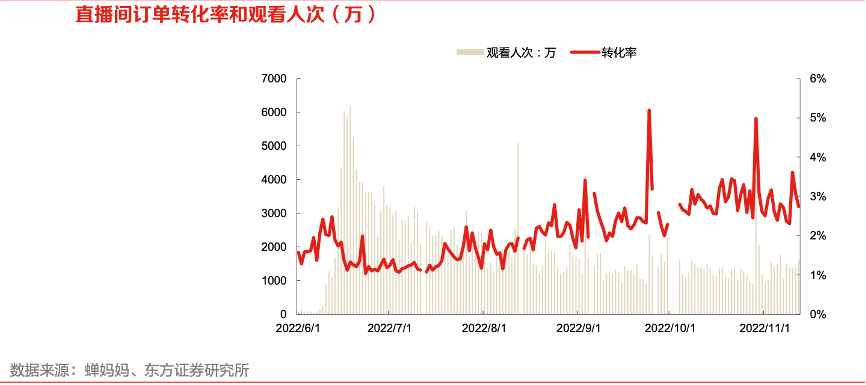經(jīng)典案例:根據(jù)蟬媽媽、東方證券研究所等綜合資訊表明,從東方甄選直播間的轉化率來看,效果顯著,即使考慮到觀看人次在 9 月開學之后下降,依然看到直播間內整體轉化率的提升,從 7 月份的 1%提 升到 10 月末的 3%左右。