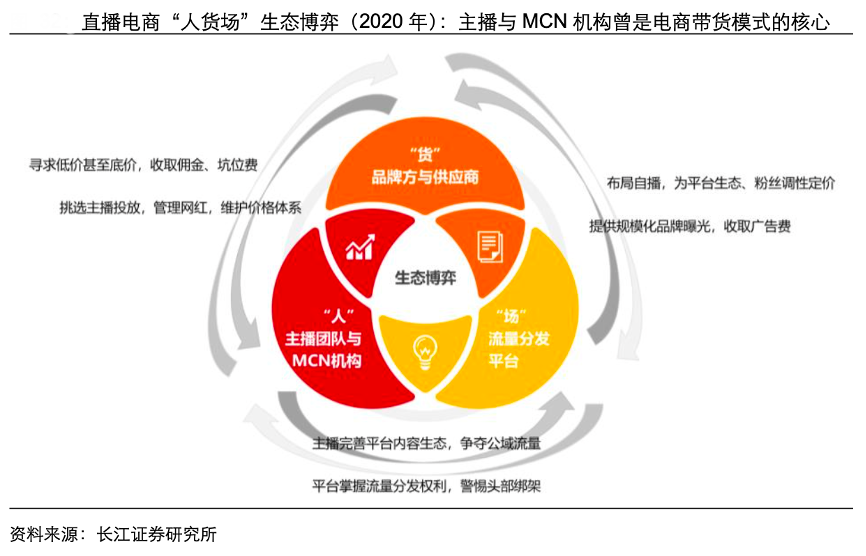 經(jīng)典案例:根據(jù)長(zhǎng)江證券研究所等綜合資訊表明,直播電商價(jià)值鏈的“人貨場(chǎng)”生態(tài)博弈是認(rèn)識(shí)產(chǎn)業(yè)的關(guān)鍵,其中的主播與 MCN 機(jī)構(gòu)在 很長(zhǎng)一段時(shí)間是電商帶貨模式的核心,主播個(gè)人影響力可變現(xiàn)為傭金、坑位費(fèi),尤其是頭部主播,更是能憑借強(qiáng)大的議價(jià)權(quán)維護(hù)影響力正循環(huán)等。