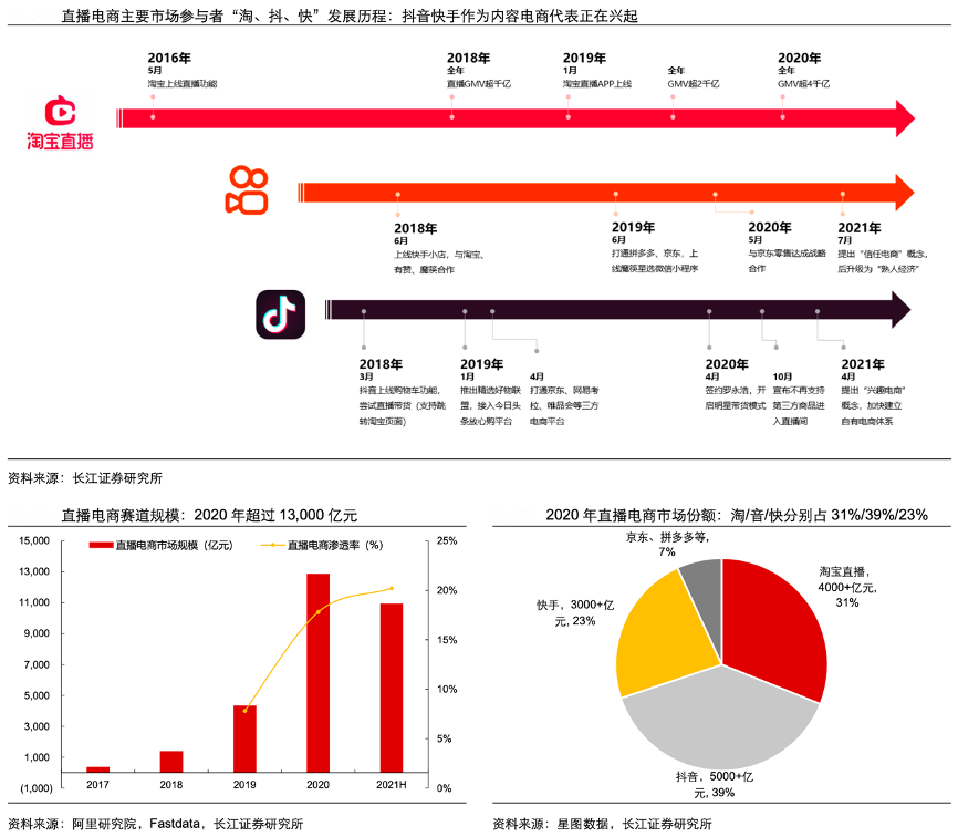 經(jīng)典案例:根據(jù)阿里研究院、Fastdata、星圖數(shù)據(jù)、長(zhǎng)江證券研究所等綜合資訊表明,復(fù)盤賽道發(fā)展,打開市場(chǎng)空間的是流媒體技術(shù)的成熟與紅人經(jīng)濟(jì)的爆發(fā)。2020年直播電商市場(chǎng)規(guī)模超過 1.2 萬億,淘、抖、快平臺(tái) GMV 分別超過 4000 億、5000 億、 3000 億,CR3 份額超 90%。主營(yíng)電商業(yè)務(wù)的淘寶是這一領(lǐng)域的先行者,2020年淘寶GMV直播超過 4000 億元,177 位主播年度 GMV 破億。
