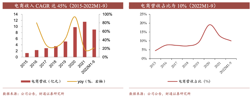 經(jīng)典案例:根據(jù)公司公告、財(cái)通證券研究所等綜合資訊表明,周大生公司電商業(yè)務(wù)保持增長態(tài)勢,2015-2021年CAGR 高達(dá) 45%。2022 年前三季度,公司電商業(yè)務(wù)實(shí)現(xiàn)營業(yè)收入 8.94 億元,同比增長 20.97%, 營收占比10%。在省代模式推動線下門店擴(kuò)張大背景下,線上收入占比仍顯著高于疫情前水平。