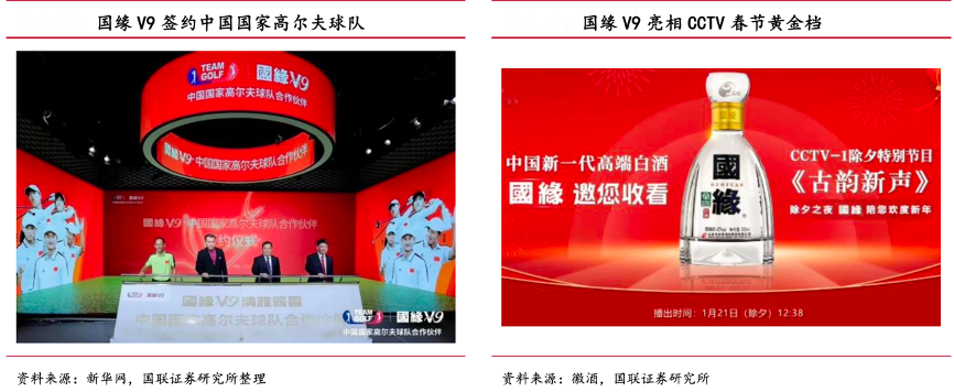 經(jīng)典案例:根據(jù)新華網(wǎng)、徽酒、國聯(lián)證券研究所等綜合資訊表明,V 系作為國緣高線產(chǎn)品,公司注重 V9 的高規(guī)格媒介傳播和高端事件營銷。新華社民族品牌工程、“國緣 V9”號(hào)衛(wèi)星、簽約國家高爾夫球隊(duì)、CCTV 春節(jié)黃金檔等營銷活動(dòng)都以 V9 作為宣傳產(chǎn)品,通過頻繁的高規(guī)格媒介露出、對(duì)接高端資源,提升品牌調(diào)性。