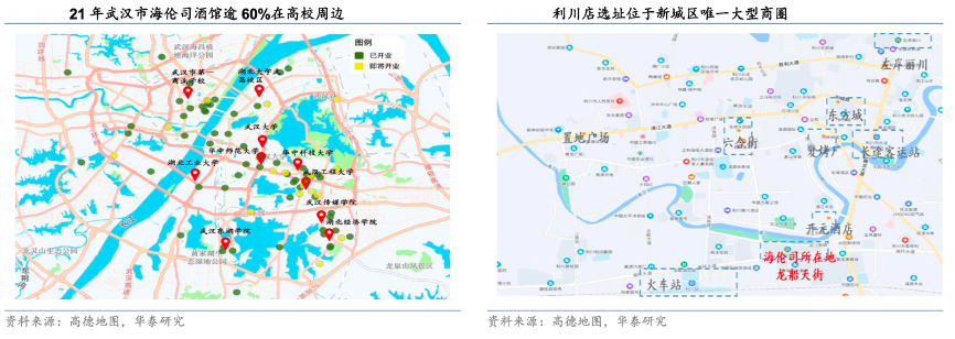 經(jīng)典案例:根據(jù)高德地圖、華泰研究等綜合資訊表明,此前,存量海倫司門店選址貼近年輕大學(xué)生, 以大學(xué)城周邊為主,以兼顧年輕人夜間消費(fèi)出行的便利性和成本的控制。據(jù)招股書,20 年 門店日平均租金約人民幣 3.1 元/m²。新模式下開店策略則有所改變,從優(yōu)質(zhì)地段的非核心 區(qū)位轉(zhuǎn)向優(yōu)質(zhì)地段的黃金點(diǎn)位(如一樓臨街、顯眼可外擺面鋪)。