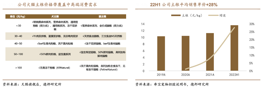經(jīng)典案例:根據(jù)天貓旗艦店、乖寶寵物招股說明書、德邦研究所等綜合資訊表明,乖寶公司自有品牌持續(xù)豐富價位段布局,雙拼、營養(yǎng)森林系列定位大眾化需求,近年重點發(fā)力弗列加特高端系列,且收獲消 費者青睞。受益于高鮮肉糧、處方糧等價格較高的高端產(chǎn)品以及弗列加特系列產(chǎn)品的熱銷,公司主糧銷售價格有所提升,22H1 已提升至 13.6 元/kg。