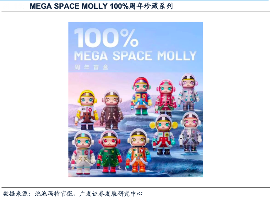 經(jīng)典案例:根據(jù)泡泡瑪特官微、廣發(fā)證券發(fā)展研究中心等綜合資訊表明,2022年8月泡泡瑪特創(chuàng)新性推出常規(guī)盲盒尺寸的MEGA系列——MEGA SPACE MOLLY 100%珍藏系列,該系列以MEGA推 出的1000%和400%尺寸的各款MEGA SPCAE MOLLY系列為原型,將其縮小為100% 尺寸,但保持了大尺寸MEGA可玩細節(jié)的一致(包括胳膊可活動、面罩可打開、攝影槍可拆卸等)。