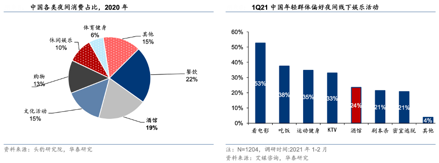 經(jīng)典案例:根據(jù)頭豹研究院、艾媒咨詢(xún)、華泰研究等綜合資訊表明,2020年酒館業(yè)態(tài)占夜間消費(fèi)規(guī)模的 19.3%,據(jù)艾媒咨詢(xún),小酒館是年輕消費(fèi)群體偏好的 TOP5 娛樂(lè)活動(dòng),調(diào)查中選擇在夜間去酒吧/小酒館的青年群體達(dá)到了 23.5%。立足長(zhǎng)期,以 Z 世代為代表的年輕一代而言,社交、娛樂(lè)已上升為剛需,伴隨這代際人群對(duì)消費(fèi)貢獻(xiàn)比重的不斷攀升,需求釋放或進(jìn)一步助力小酒館市場(chǎng)規(guī)模擴(kuò)大。