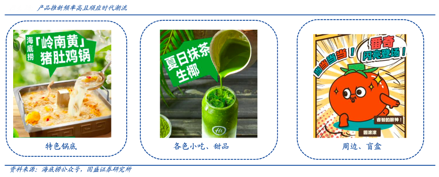 經(jīng)典案例:根據(jù)海底撈公眾號(hào)、國(guó)盛證券研究所等綜合資訊表明,相較于絕大多數(shù)火鍋店一成不變的鍋底和菜品,海底撈的推新頻率頗高,“餐+茶”概念近幾年爆紅網(wǎng)絡(luò),海底撈推出“9.9 元 DIY”奶茶,一經(jīng)推出便在各大網(wǎng)絡(luò)平臺(tái)爆火。而在周邊產(chǎn)品方面,海底撈不定時(shí)推出周邊產(chǎn)品也吸引了很多潮玩收集者的關(guān)注,海底撈會(huì)員商城上新自制環(huán)保袋、袖套、便利貼、平板電腦保護(hù)套、手賬本等。
