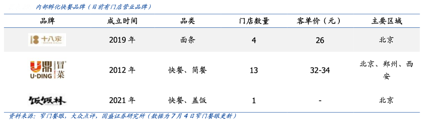 經(jīng)典案例:根據(jù)窄門餐眼、大眾點(diǎn)評(píng)、國(guó)盛證券研究所等綜合資訊表明,海底撈主要通過(guò)內(nèi)部孵化品牌橫向延申,目前已孵化品牌有 U 鼎冒菜、十八汆、撈派有面兒等;外部收購(gòu)品牌有漢舍中國(guó)菜、Hao Noodle 等。孵化品牌大多數(shù)是客單價(jià) 20-30 元的快餐,可復(fù)制性強(qiáng)、投入低,海底撈可利用自身成熟的產(chǎn)業(yè)鏈保駕護(hù)航、快速切入快餐賽道。