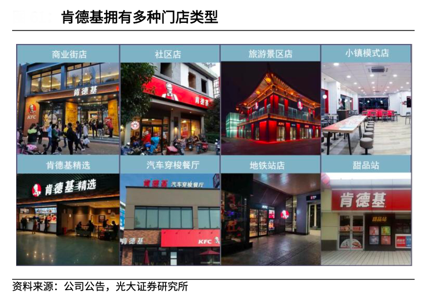 經(jīng)典案例:根據(jù)公司公告、光大證券研究所等綜合資訊表明,目前肯德基提供 了四種門店模式(標(biāo)準(zhǔn)店、Future store、Mini 店及下沉市場(chǎng)餐廳)及多種功能模塊(To Go、肩并肩、咖啡車、小站等),這些模塊根據(jù)需求可以靈活組裝在任 何一種新店模式之上。百勝中國(guó)積極探索拓店新模式,開設(shè)更多小型餐廳控制成本,從盈利模型看,小店投入更小、回收期更短、利潤(rùn)率更高。