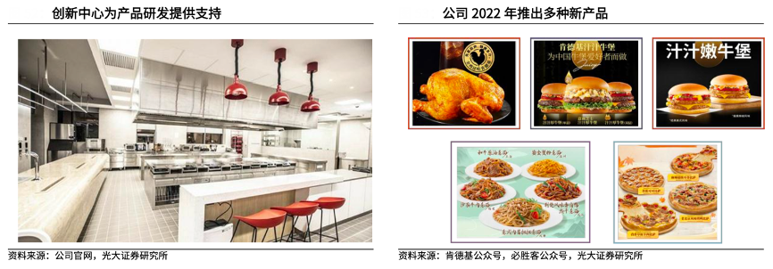 經(jīng)典案例:根據(jù)公司官網(wǎng)、肯德基公眾號(hào)、必勝客公眾號(hào)、光大證券研究所等綜合資訊表明, 2019年3月,肯德基公司位于上海的創(chuàng)新中心正式投入使用,該中心為一體化研發(fā)中心,配備世界頂級(jí)設(shè)備,包括測(cè)試廚房、感官測(cè)試區(qū)域以及一整套實(shí)驗(yàn)室,涵蓋品質(zhì)管理、設(shè)備與餐廳技術(shù)應(yīng)用測(cè)試以及內(nèi)容制作等諸多領(lǐng)域,為新產(chǎn)品研發(fā)和加強(qiáng)餐廳現(xiàn)代化管理提供支持。2022年,公司共推出 500 余款新產(chǎn)品及改良產(chǎn)品,其中不乏全新上市的“秘汁全雞”等現(xiàn)象級(jí)爆款產(chǎn)品,持續(xù)提升品牌吸引力。